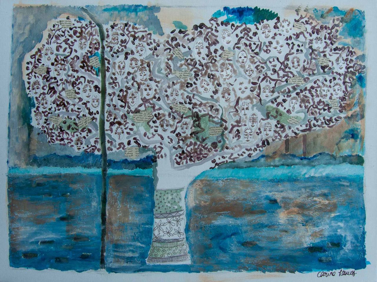 La toile devient une terre fertile d’où jaillissent des formes figuratives végétales ou des taches, des empreintes, des traces toujours en quête d’une histoire à raconter, d’un souvenir à raviver et partager.
